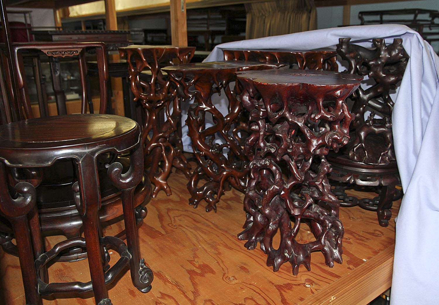 Although I’ve made several dozen study visits to the exhibition I was immediately startled by a color change of the new tablecloth color this year. A couple of days ago Peter Warren, who helped set up the exhibition, posted a few photos in his blog (http://saruyama-bonsai.blogspot.jp) which showed the new tablecloths. I thought that the color balance must be off between Peter’s photos and internet reproduction, but they were correct. In the past the tablecloths have been mostly a dark navy blue color and most recently light blue. This year they are a bright blue/green, my favorite color for bonsai containers. However, personally, the new color detracts from the quiet atmosphere of the presentation of the world’s finest bonsai. But, this is only my personal opinion, which might change during the next week during my many visits to the exhibition.