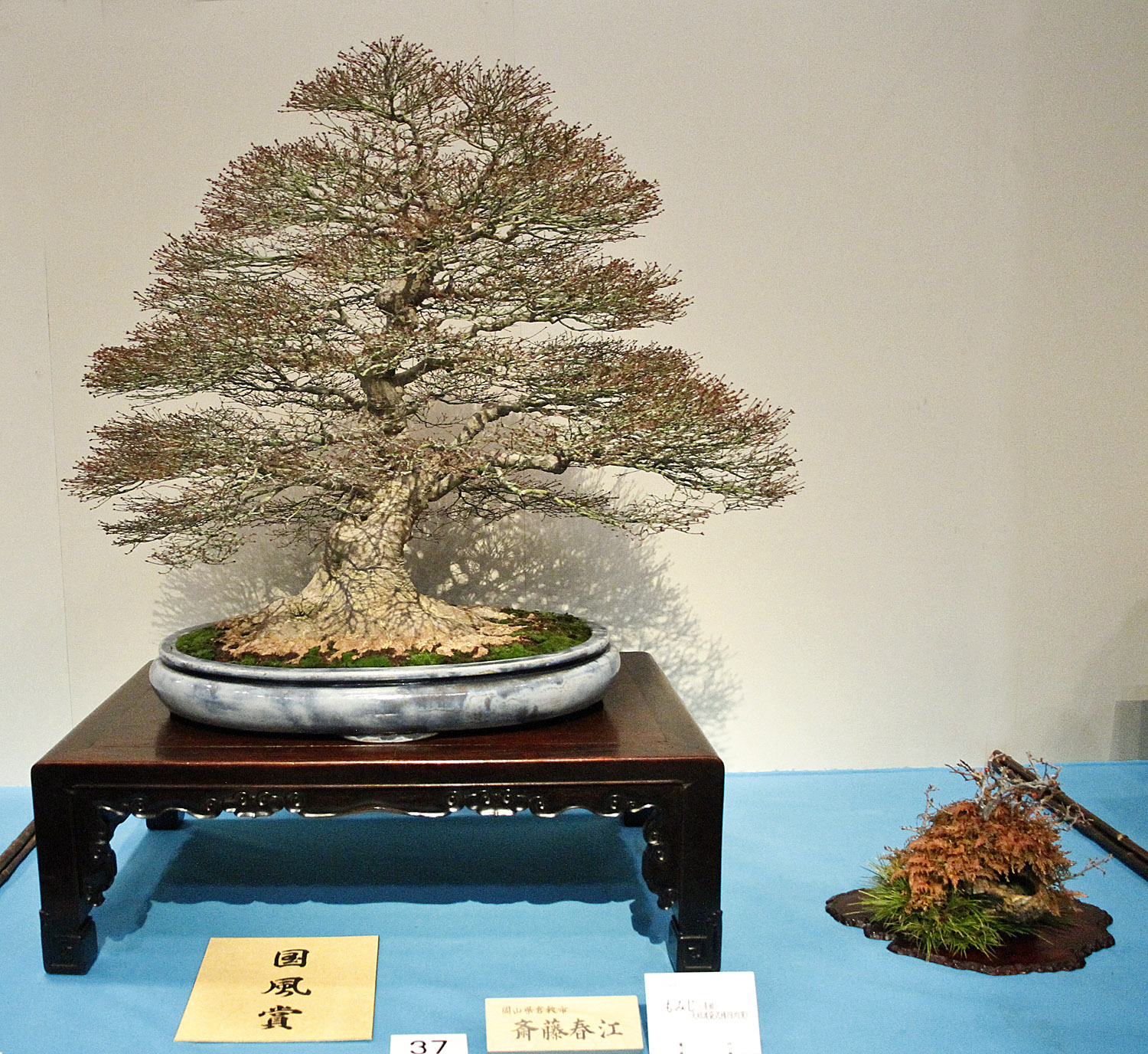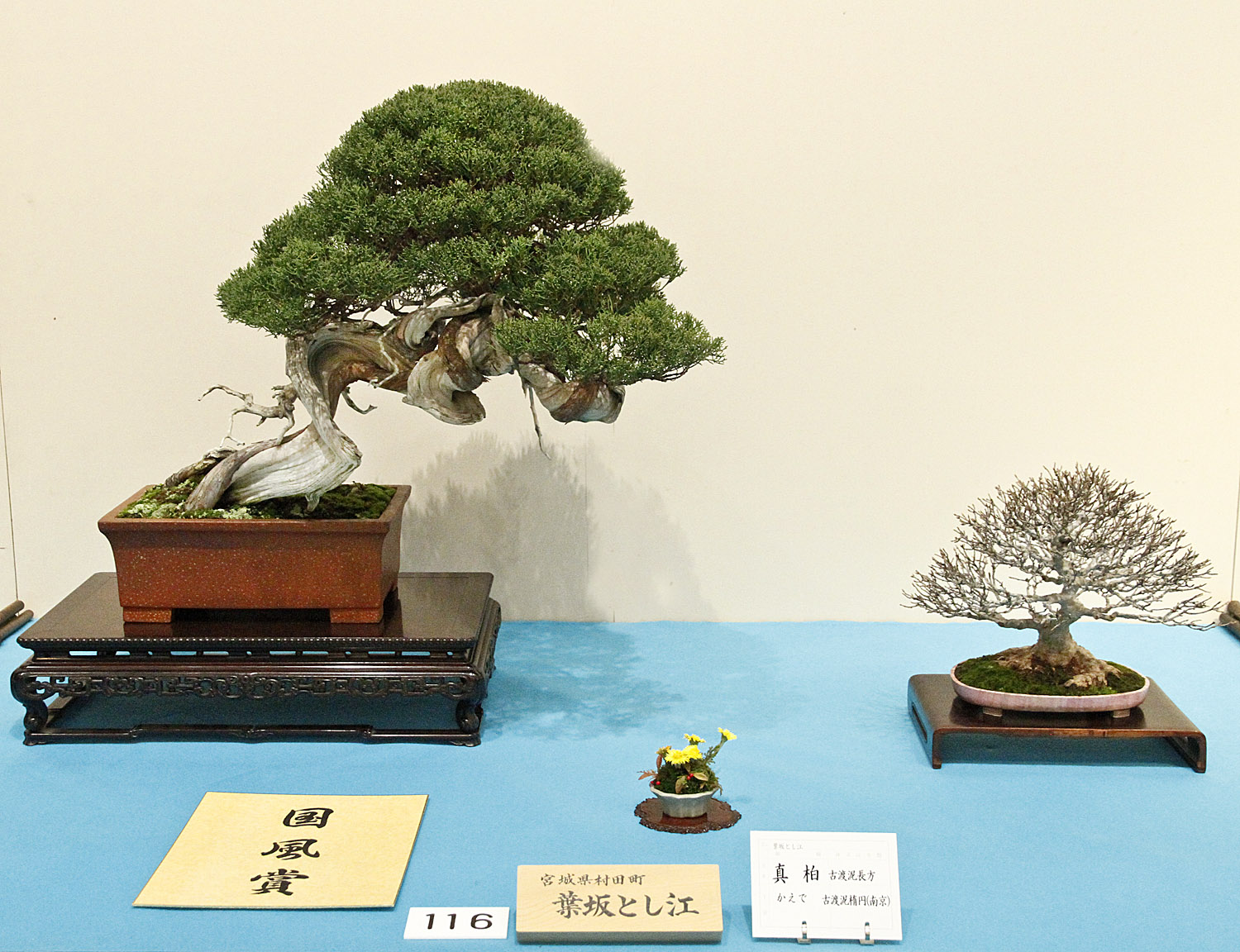 The 2014 88th Kokufu Bonsai Exhibition– Part 1 was composed of 170 displays, including 29 Important Bonsai Masterpieces. After the exhibition is set up a group of judges awarded five coveted National Awards (Kokufu-sho). There were only five shohin bonsai compositions, a mame bonsai composition was not included in this part. There were 46 medium size three-point exhibits which included a main bonsai, often two, and a companion planting. Considering that each shohin bonsai composition had six main bonsai and a side tree (all very consistent which shows the current taste of display) and most medium size exhibits had two trees nearly 300 individual specimens were shown. Two Americans, Doug Paul and Frank Cucchira, displayed Sargent juniper bonsai. Another exhibitor from Italy also displayed a Sargent juniper bonsai and received one of the five Kokufu-sho awards, the first time for a foreigner.