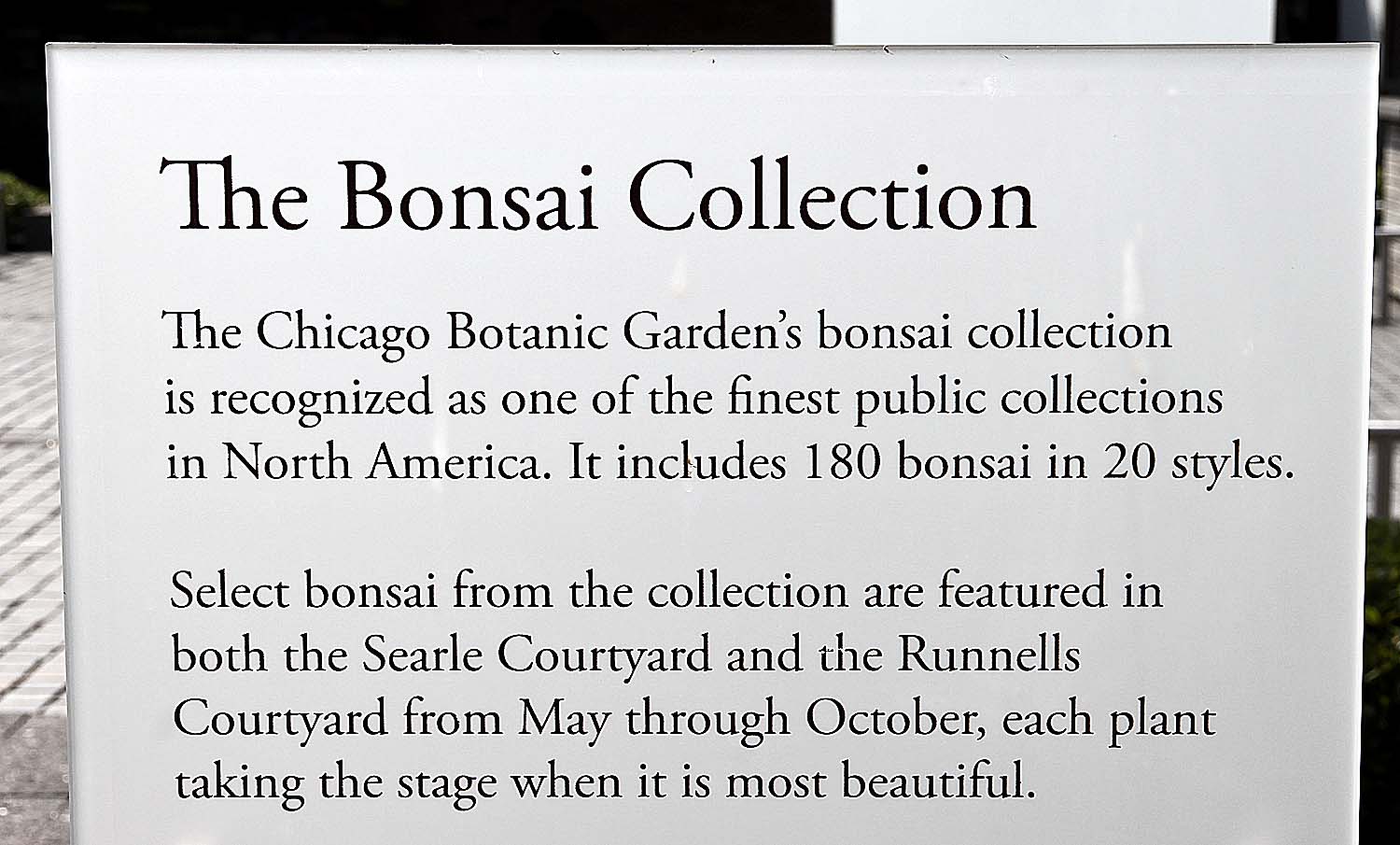 The Chicago Botanic Garden has a world class bonsai collection. Several years ago bonsai artist Susumu Nakamua from Yokohama, Japan, presented his finest trees to the Chicago Botanic Garden to supplement their collection.