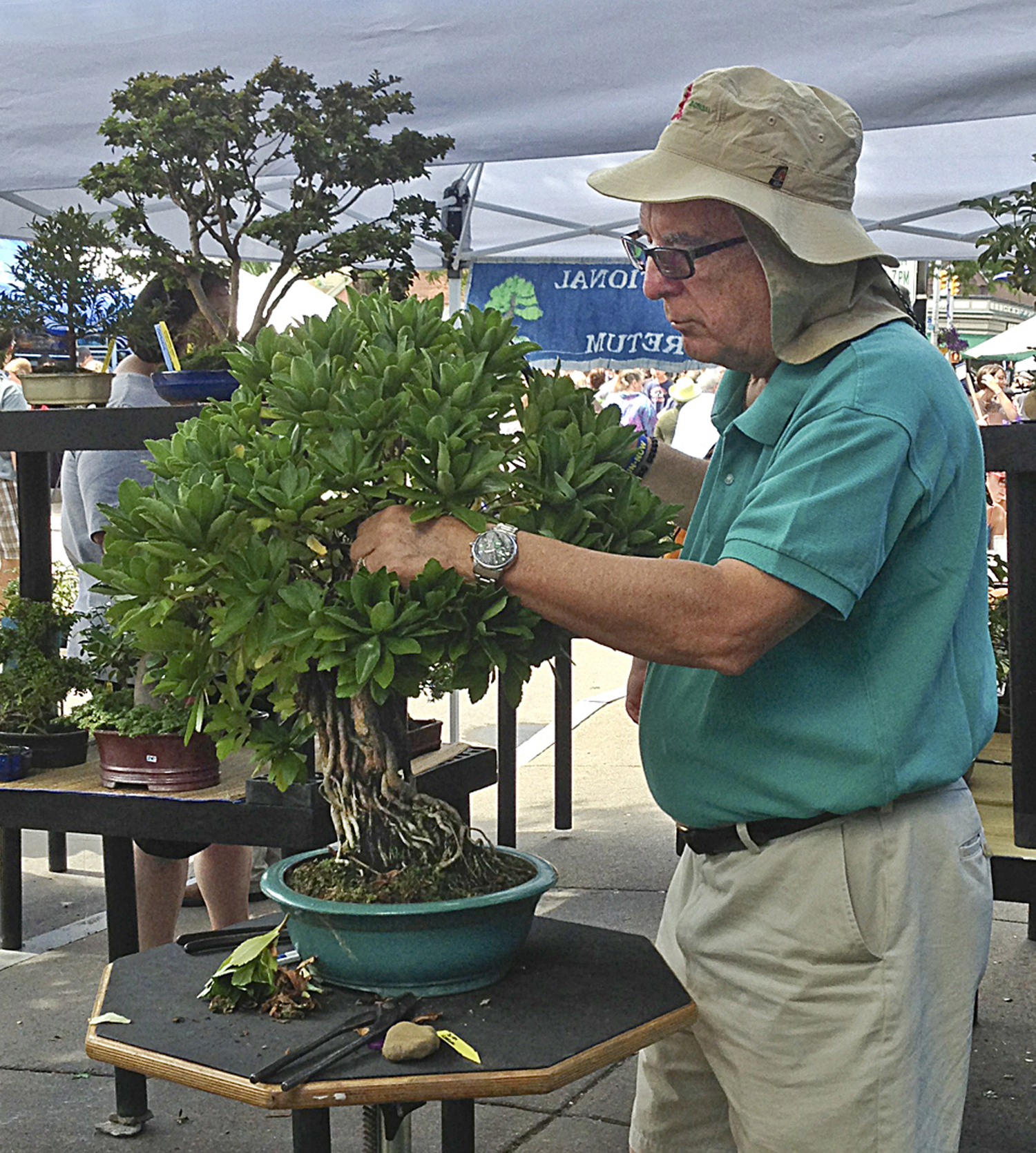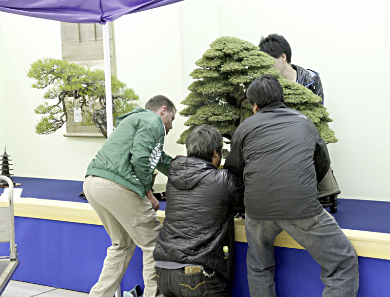 Large size bonsai being positioned on display table.
